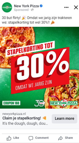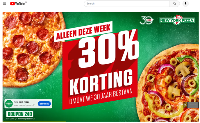 Afbeelding 4 t/m 7: Consistentie in New York Pizza advertenties over verschillende kanalen heen.