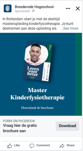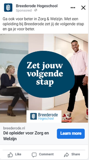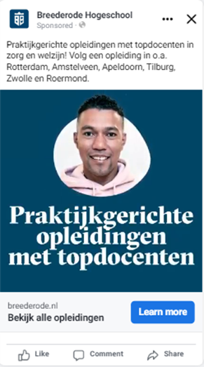 Afbeelding 1 t/m 3: Consistentie in boodschap, maar steeds een stapje verder in de touch-, tell-, collect-funnel in advertenties voor Breederode Hogeschool