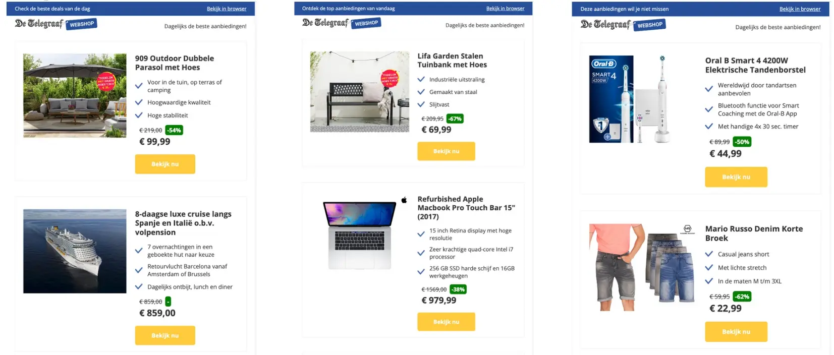 Mediahuis verzendt dagelijks nieuwsbrieven naar haar klanten. Deze nieuwsbrieven dienen diverse doelen, zoals het introduceren van nieuwe producten, het benadrukken van bestaande aanbiedingen en kortingsacties en natuurlijk het stimuleren van klanten om vanuit de nieuwsbrief door te klikken naar de webshop. Dit gedrag wordt vervolgens met behulp van een DMP (Data Management Platform) getrackt en is de ruggengraat van automatische campagnes. Het verzenden van nieuwsbrieven is daarom een onmisbare, terugkerende campagne in een doordachte e-mail strategie.